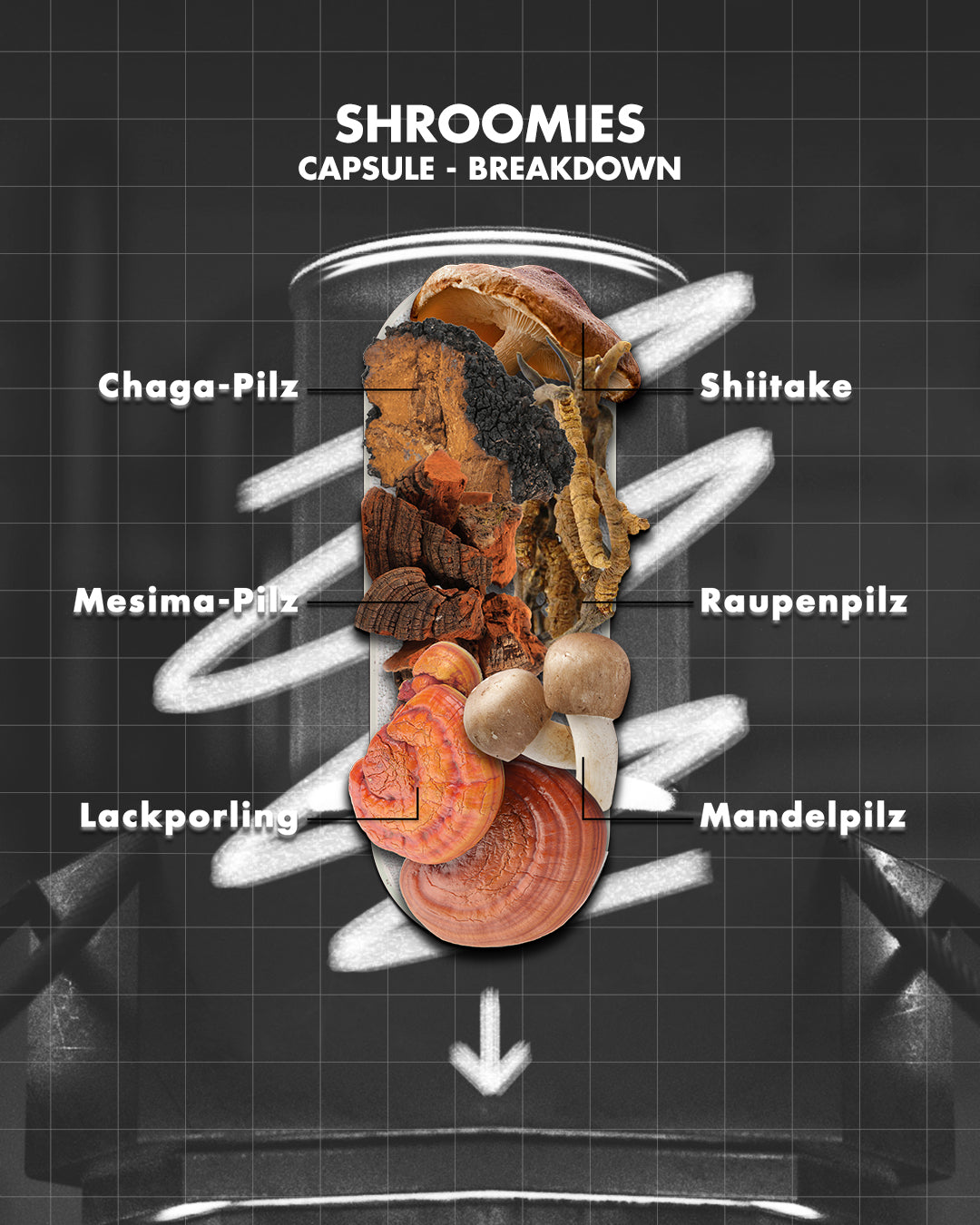 Shroomies ist unsere Premium-Mischung aus 6 hochwertigen Pilz-Extrakten, entwickelt für Nachtschwärmer, die auch nach durchgefeierten Nächten nicht aus dem Rhythmus geraten wollen. Diese einzigartige Formel vereint: